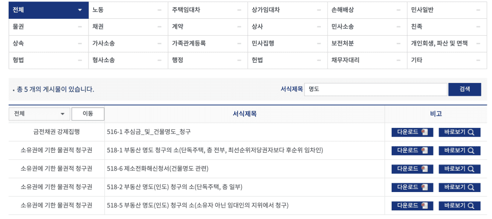 하단 링크를 들어가신 후에 확인해 보시면 양식이 나올 겁니다. 대한법률구조공단은 검색칸에 ‘명도’를 치시면 되고 법원 전자민원센터는 바로 보실 수 있습니다. 자신에게 해당하는 사례를 클릭하시면 자세히 보실 수 있습니다. 찾기 편하시게끔 캡처 이미지도 첨부합니다.